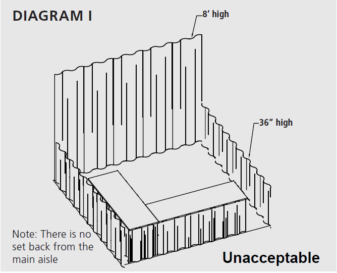 - When three or more in-line booths are used in combination as a single exhibit booth, the four-foot (4') height limitation is applied only to that portion of the exhibit booth which is ten feet (10') from an adjoining booth or aisle – see Diagram B.
