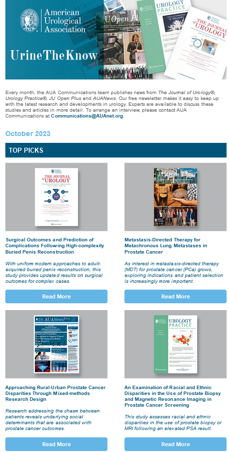 Every month, the AUA Communications team publishes news from The Journal of Urology®, Urology Practice®, JU Open Plus and AUANews. Our free newsletter makes it easy to keep up with the latest research and developments in urology. Experts are available to discuss these studies and articles in more detail.