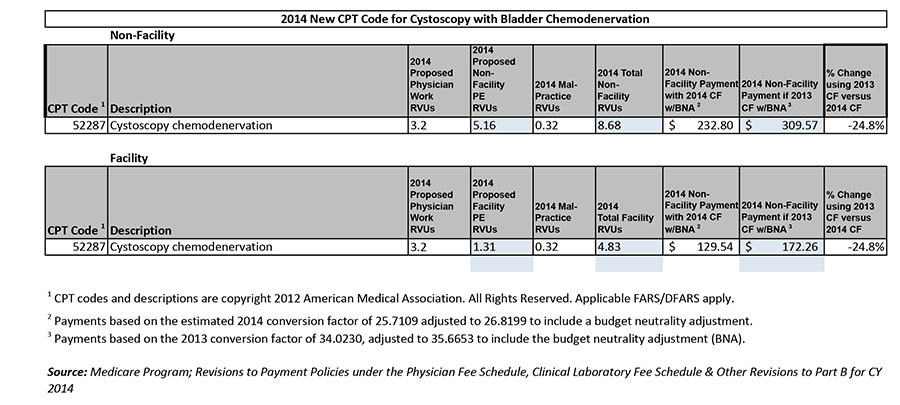 The following chart illustrates physician payment changes for several urology codes in 2014 using two calculations: 1) based on the 24.4 percent reduction in the CF and 2) if Congress maintains the 2014 CF rate.