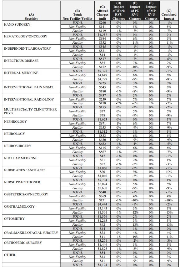 Table 92 of the rule (Appendix A of this summary) estimates the specialty level impacts of the policies included in the proposed rule and includes impacts of rate-setting changes and changes to RVUs within the budget-neutral system. The impact of the proposed rule’s policies on group practices and individual physicians varies based on practice type and the mix of patients and services provided to those patients.