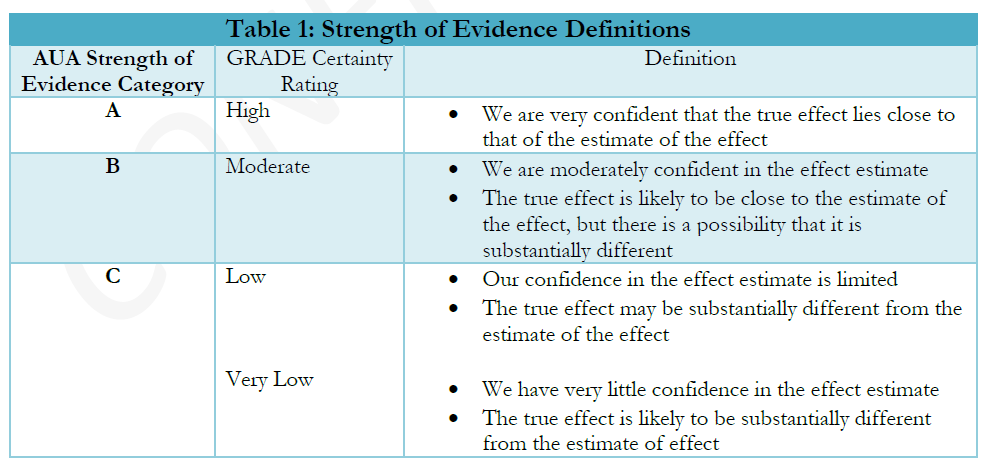 This AUA guideline is provided free of use to the general public for academic and research purposes. However, any person or company accessing AUA guidelines for promotional or commercial use must obtain a licensed copy. To obtain the licensable copy of this guideline, please contact Keith Price at kprice@auanet.org.
