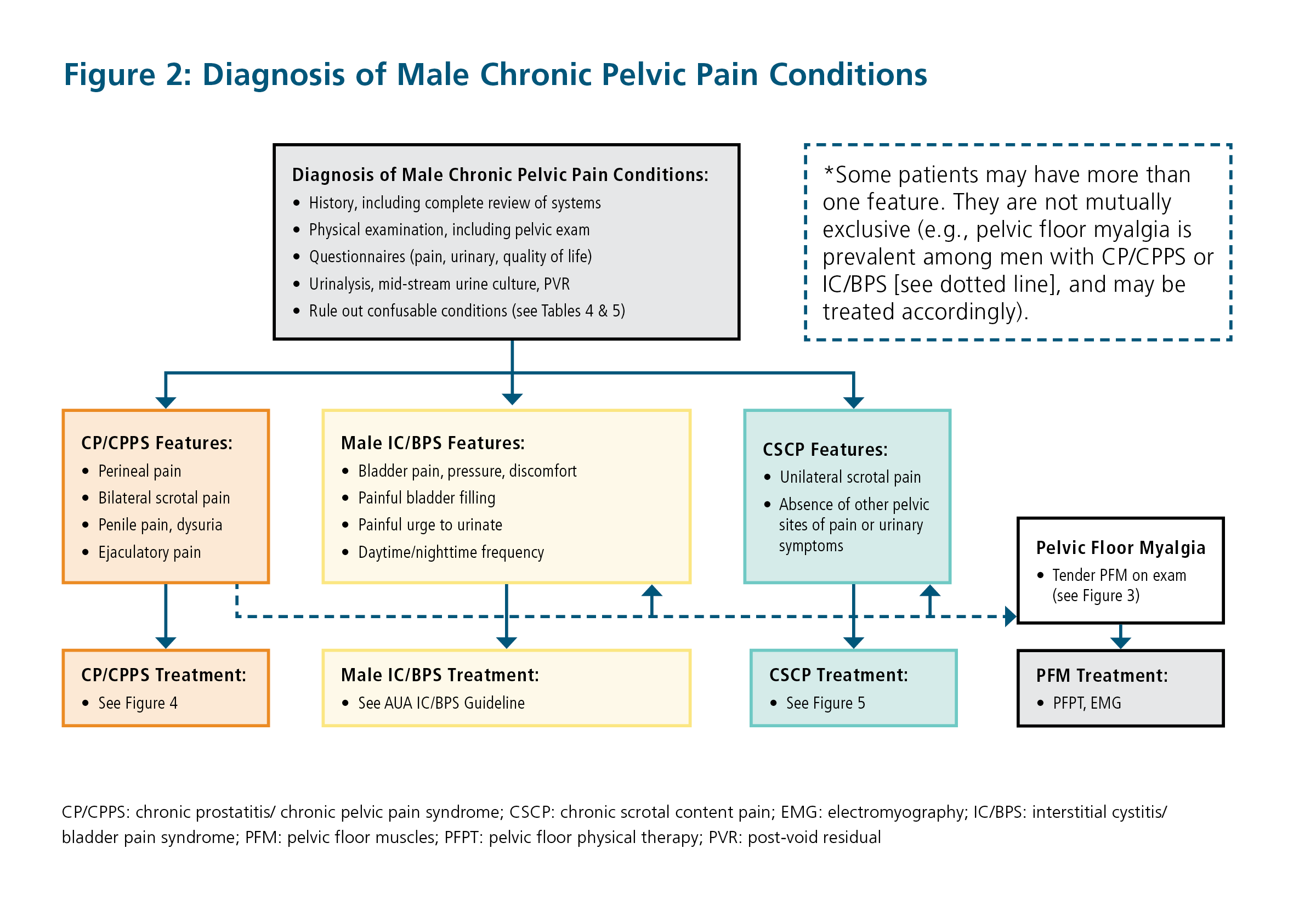 Lai HH, Pontari MA, Argoff CE, et al. Male Chronic Pelvic Pain: AUA Guideline: Part I Evaluation and Management Approach. J Urol. 0(0). doi:10.1097/JU.0000000000004564. https://www.auajournals.org/doi/10.1097/JU.0000000000004564