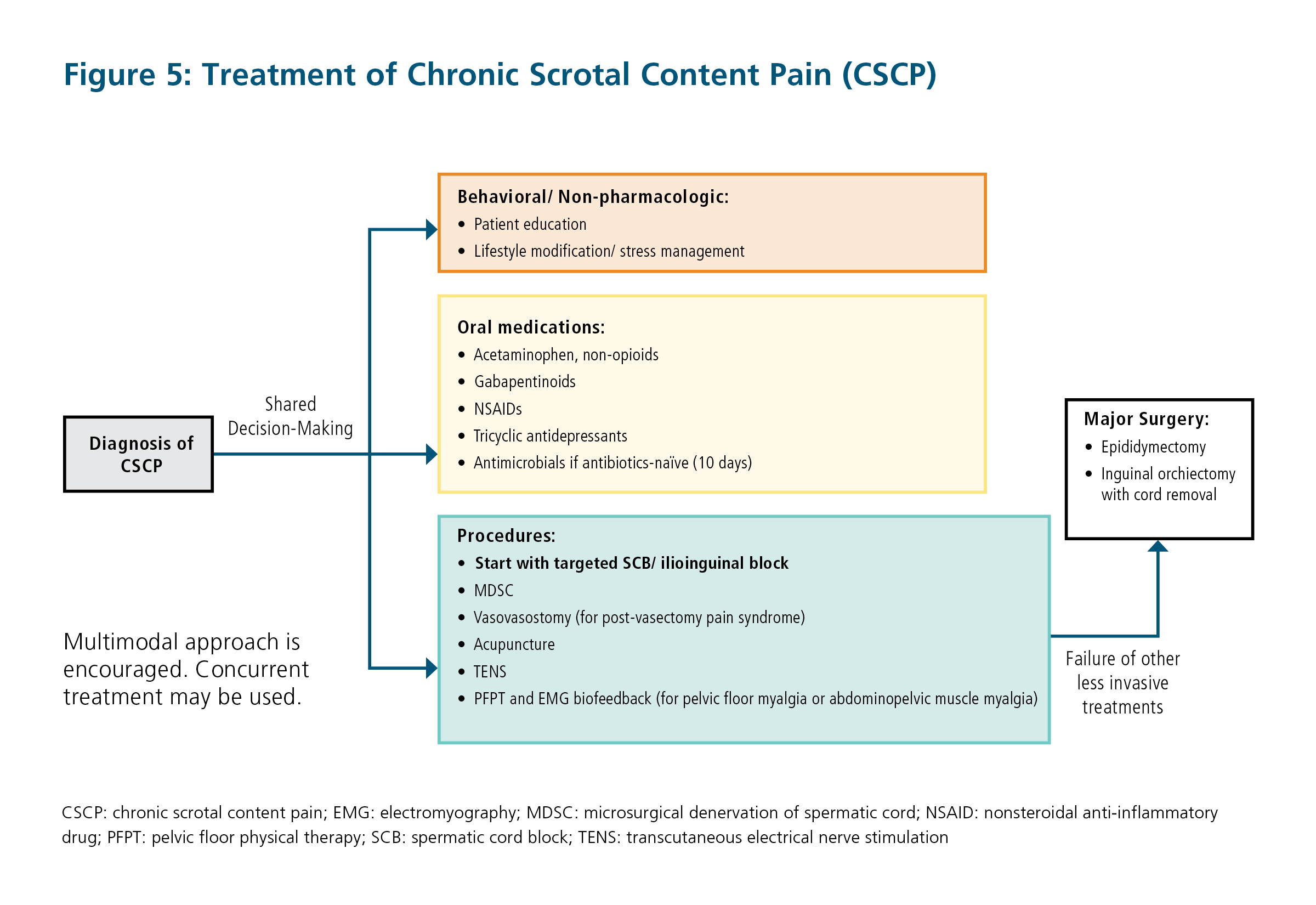Lai HH, Pontari MA, Argoff CE, at al. Male Chronic Pelvic Pain: AUA Guideline: Part III Treatment of Chronic Scrotal Content Pain. J Urol. 0(0). doi:10.1097/JU.0000000000004566. https://www.auajournals.org/doi/10.1097/JU.0000000000004566