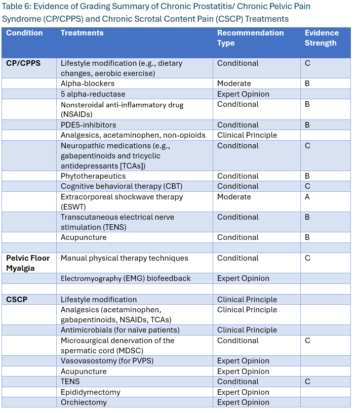 Lai HH, Pontari MA, Argoff CE, et al. Male Chronic Pelvic Pain: AUA Guideline: Part II Treatment of Chronic Prostatitis/Chronic Pelvic Pain Syndrome. J Urol. 0(0). doi:10.1097/JU.0000000000004565. https://www.auajournals.org/doi/10.1097/JU.0000000000004565