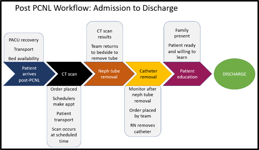 At our institution, post-PCNL discharge requires several steps, and each can lead to delay in hospital discharge. Post-procedure CT scan is obtained to verify stone clearance and identify other postoperative complications. If the CT scan results and not available by morning rounds to confirm nephrostomy tube removal is appropriate, the surgical team must return to the floor later to remove the tube. Doing this in a timely manner can be challenging on busy clinic or operative days. Patients must be educated on postoperative expectations, aftercares, and return precautions. While much of this education is done in the pre-operative setting, we also require postoperative education by nursing staff to reinforce important concepts. We found that mornings are often difficult times to perform patient education due to the plethora of other nursing tasks, and shortages in nursing staff added further difficulty to timely patient education.