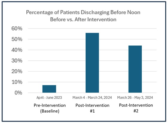 Success was defined as increasing the number of discharges before noon from 7% of patients to 25% of patients. Baseline data were collected prior to intervention. Potential causes were identified using stakeholder analysis findings, unstructured team discussions, and a Cause and Effect (Fishbone) Diagram. An Impact/Effort Grid was used to determine which interventions to implement. Postintervention data were collected, and a balancing measure (number of unplanned Emergency Department or clinic visits within 30 days of discharge) was included to ensure expedited discharges did not negatively impact patient outcomes or care.