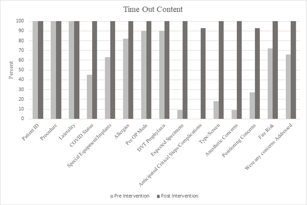 Metrics of success included engagement and adherence to the standardized content. Therefore, time outs were audited and scored based on staff participation and how many of the 15 elements were discussed during the time out.