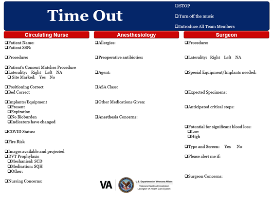 Locally, the standardized visual time out board has been utilized in three operating rooms, with good success. Successful adoption of this practice requires adequate buy in from all three participating services and accountability between them. This intervention can be scaled to improve practice nationally to encourage engagement and transform the time out into an active conversation between surgical staff, and ensure all necessary elements are discussed for every patient procedure.