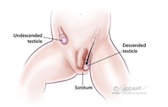 Testis tumors are relatively rare (1-2% of all pediatric solid tumors) and typically occur at two timepoints – between ages 2-4 years and again around puberty. Primary tumors are divided into two types based on the cell of origin: germ cell tumors and non-germ cell tumors, the former comprising the majority (~95%). Risk factors for germ cell tumors include undescended testicles (cryptorchidism; Figure 1), family history, personal history of germ cell tumors, and a precancerous lesion called germ cell neoplasia in situ. Early (pre-puberty) correction of undescended testicles with a surgery called orchiopexy might reduce the future risk of germ cell tumors. More than half of these tumors in children and adolescents are benign, with pre-pubertal mature teratoma being the most common benign tumor.