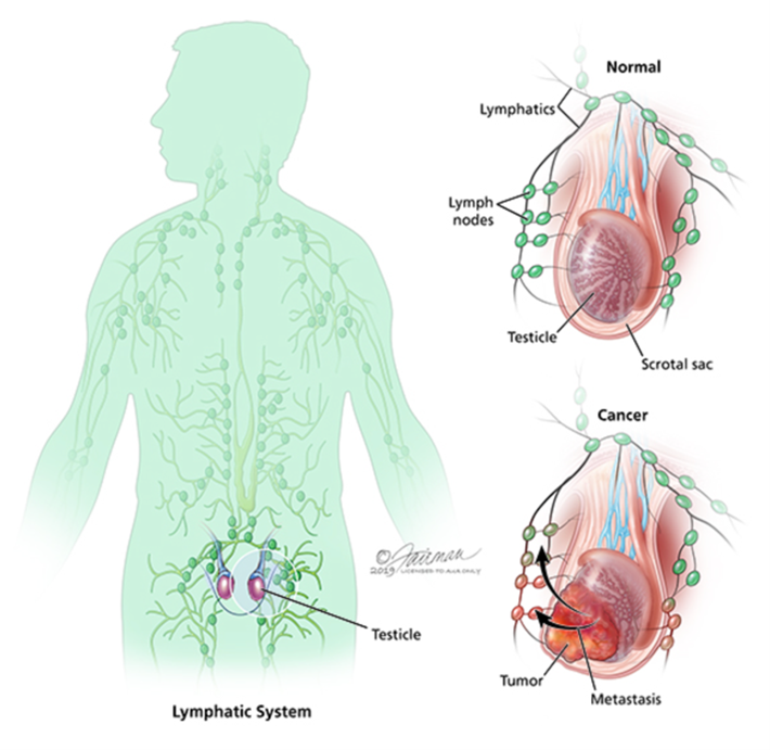 Diagnosis and staging: The most common presentation is a painless mass in the testicle itself. There might be other systemic symptoms depending on the type of non-germ cell tumor (see below) and if the germ cell tumor has spread beyond the testicle (metastasis). Initial evaluation typically consists of a physical exam, tumor markers, and a scrotal ultrasound. Tumor markers include AFP, β-hCG, and LDH which might be elevated for some germ cell tumor. Some markers are specific to certain tumor histologies (Table 4). Their decline after surgery indicates potential cure with tumor removal alone. LDH is the most non-specific of these markers. Hormones might also be assessed for some non-germ cell tumors. If the scrotal ultrasound suggests a malignant tumor, patients will undergo staging imaging with CT of the chest, abdomen, and pelvis. The most common site of metastatic spread for germ cell tumors would be the lymph nodes in the retroperitoneum (Figure 2). A general description of staging is noted in Table 5.