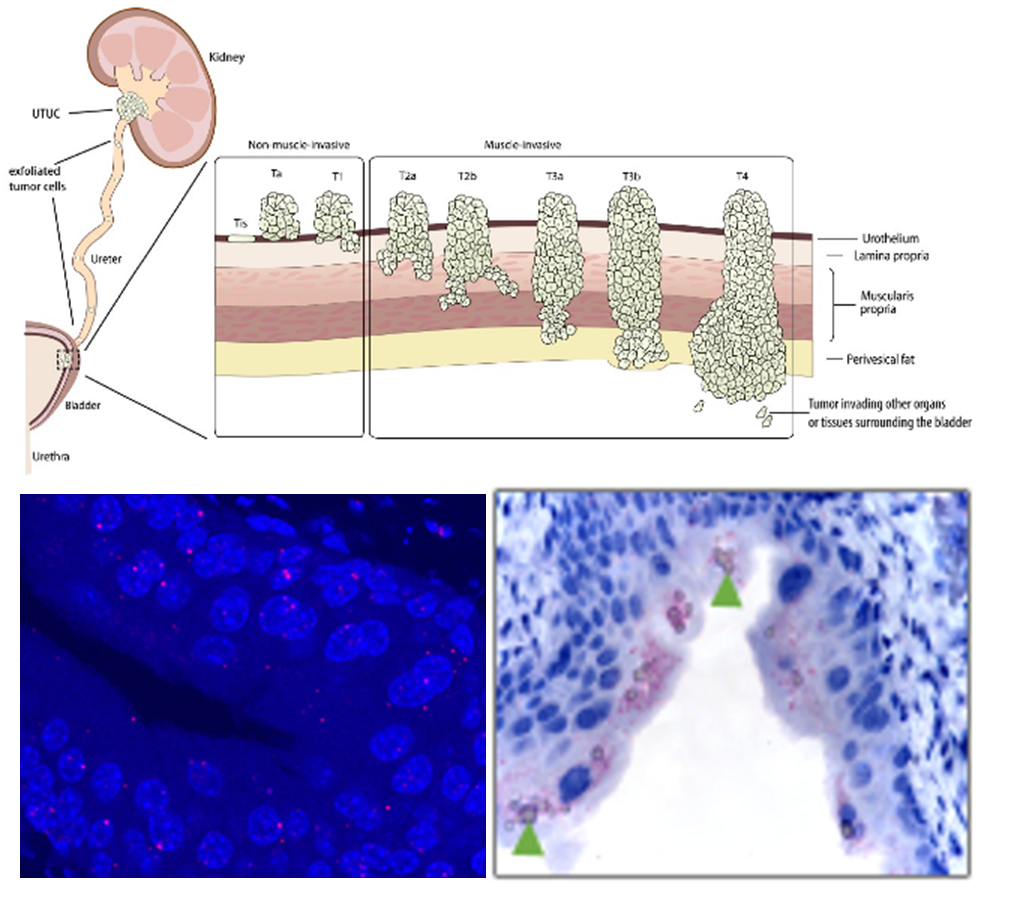 Figure 2: Top panel: A revisualization of the layers in the upper urinary tract concerning tumor invasion. Source: https://www.mdpi.com/2075-4418/13/5/1004 Bottom right and left panels: Urothelium magnified at 40x with depiction of urothelial layers and apical 'umbrella cells' (green arrows) as well as basal urothelium overlying the lamina propria in a mouse bladder. Here, oncogene CDKN2a RNA expression is also depicted in red punctae - RNA scope. Source: Antony, 2023, figures reproduced with permission from Al Nagar, Iman