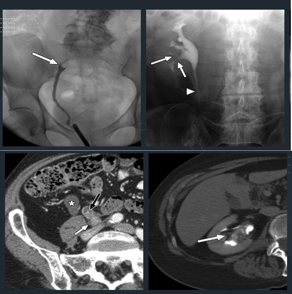 Figure 5: Radiograph and CT depiction of 'filling defects' corresponding to contrast delineating the passable lumen of the urinary tract. Source: https://ajronline.org/doi/full/10.2214/ajr.09.2577