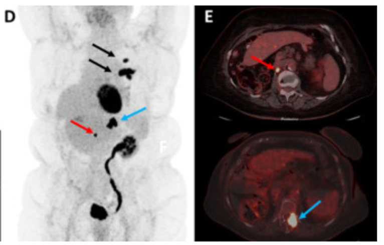 Figure 7: FDG PET avid signal corresponding to retroperitoneal lymph nodes (red arrow), lung metastasis (black arrow), and bone metastasis to spine (blue arrow) following nephroureterectomy for UTUC Source: https://www.sciencedirect.com/science/article/pii/S0001299821001057#fig0006