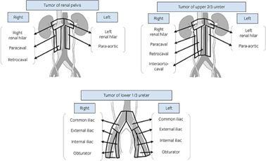 - Pyelocaliceal system: lymph nodes of ipsilateral great vessels extending from renal hilum to inferior mesenteric artery