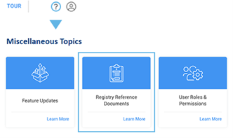 In order to access the AQUA Registry’s resources page, you will need to log into the AQUA Registry Dashboard. From there, click on the question mark located in the upper right hand-side of your screen (See below image). Next, click on “Miscellaneous Topics” followed by “Registry Reference Documents.”