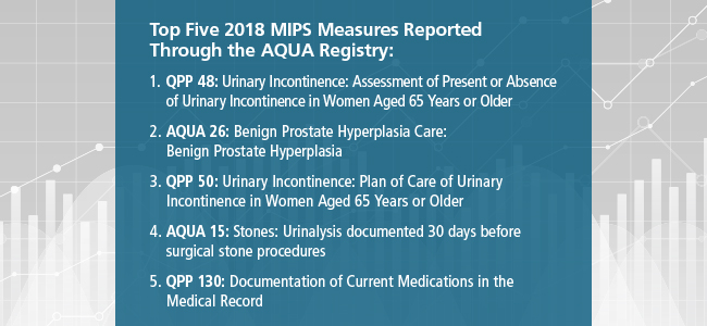 A Review of 2018 MIPS Reporting Through the AQUA RegistryThe AQUA Registry is a “one-stop shop” for urologic care providers to satisfy Centers for Medicare and Medicaid Services (CMS) Quality Payment Program (QPP) requirements for the Merit-based Incentive Payment System (MIPS). Participation in the AQUA Registry, at the Elite level, allows practices to report on quality measures and attest for the Promoting Interoperability (PI) and Improvement Activities (IA) categories. CMS has approved the AQUA Registry to report on behalf of its participants as a Qualified Clinical Data Registry (QCDR) for the past three years. AQUA Registry providers reported on 6 out of over 50 measures, which include both standard QPP and Non-QPP, urology-specific measures. |