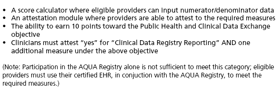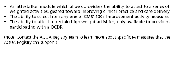 How to use the AQUA Registry to attest to the Promoting Interoperability (PI) and Improvement Activities (IA) categories of the MIPS requirements. PI and IA are 2 of the 4 categories required by MIPS and together account for 40% of the overall score. |